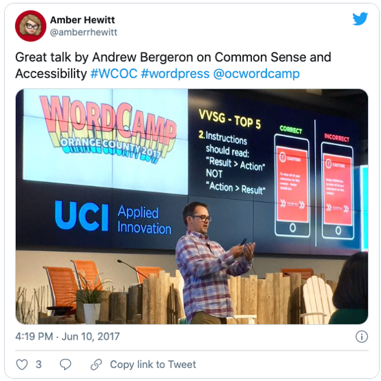 In November 2016, Andrew was given the opportunity to present a talk titled “Common Sense and Accessibility” at UX Speakeasy’s monthly San Diego Meet Up. During the presentation, he reviewed a few practical techniques from his VVSG research which UX designers could immediately incorporate into their own designs to benefit those users with accessibility needs. He also shared examples of how these techniques often (unintentionally) benefit a wider user audience.